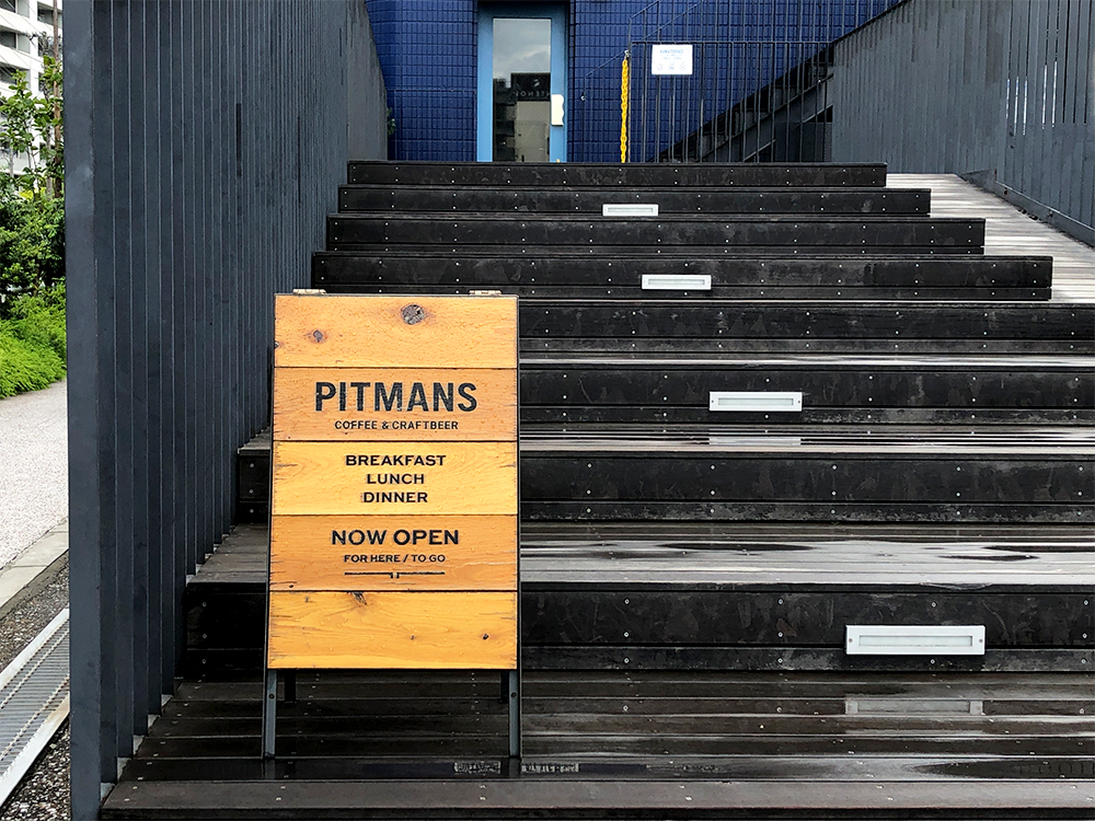 水天宮前駅より徒歩10分、隅田川沿いに位置する「PITMANS」。隅田川を渡り、建物の前まで行くとおしゃれな立て看板が出迎えてくれます。
