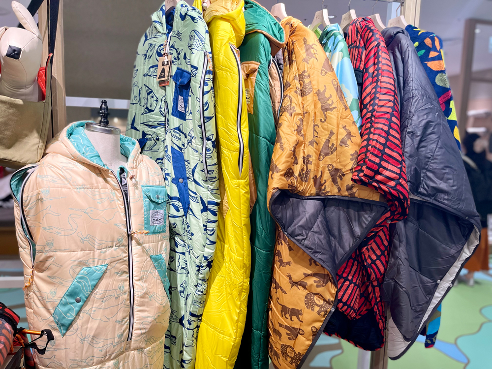 寝袋のような形状、素材ですが、腕部分にファスナーが付属しており、ここから腕を出して着用できます。裾は伸ばせば寝袋に、裾を止めて長さを調整すれば歩くこともできる…というハイブリッドな逸品です。プルオーバーのほか、ブランケットのようにも使用できるポンチョタイプも使い勝手抜群ですよ。