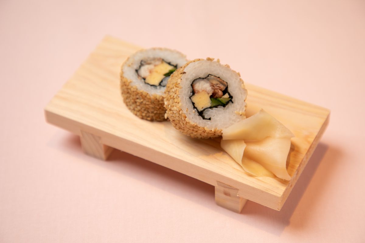 栃木県栃木市の「幻の共水うなぎの裏巻き(900円)」は、栃木市内の人気うなぎ店「せしも」が焼いた貴重な共水うなぎの蒲焼を巻物に。キュウリ、厚焼き卵と一緒に裏巻きして、煎りゴマをふりかけています。うなぎの甘さとうまみもしっかり感じられます。
