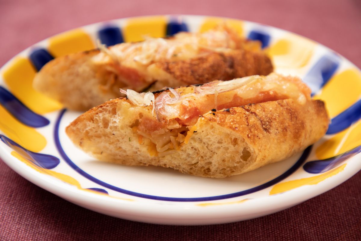 福岡県新宮町の「無着色めんたいこドック(600円)」は、程よい辛味とユズのさっぱりとした味わいが特徴の明太子を、レンコンとニンジンのきんぴらと一緒に自家製魚パンに挟みました。濃厚なチーズの旨味がきいた、食べごたえのある一品です。