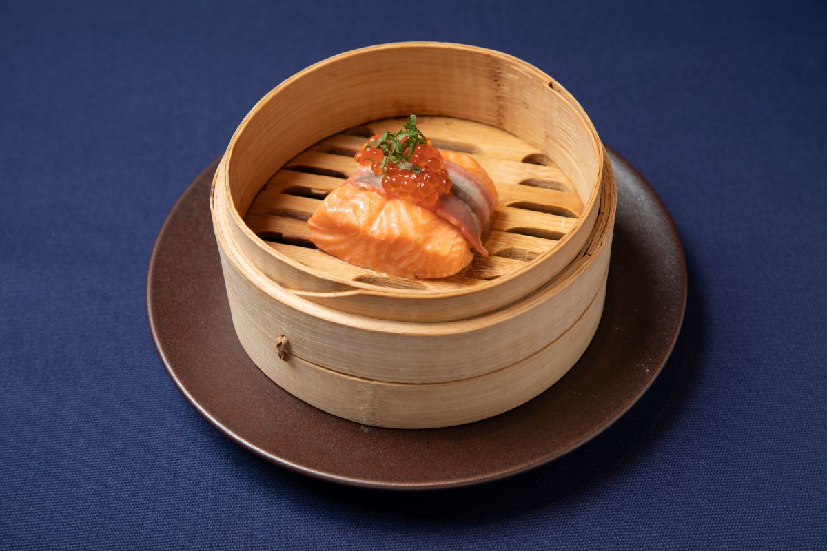 北海道八雲町の「二海サーモンの酒蒸し いくらを添えて(900円)」は、程よい脂でさっぱりとしているトラウトサーモンの半身を使っています。ベーコンと大葉で巻き、お酒でセイロ蒸しにしました。イクラのプチプチ感がアクセントです。