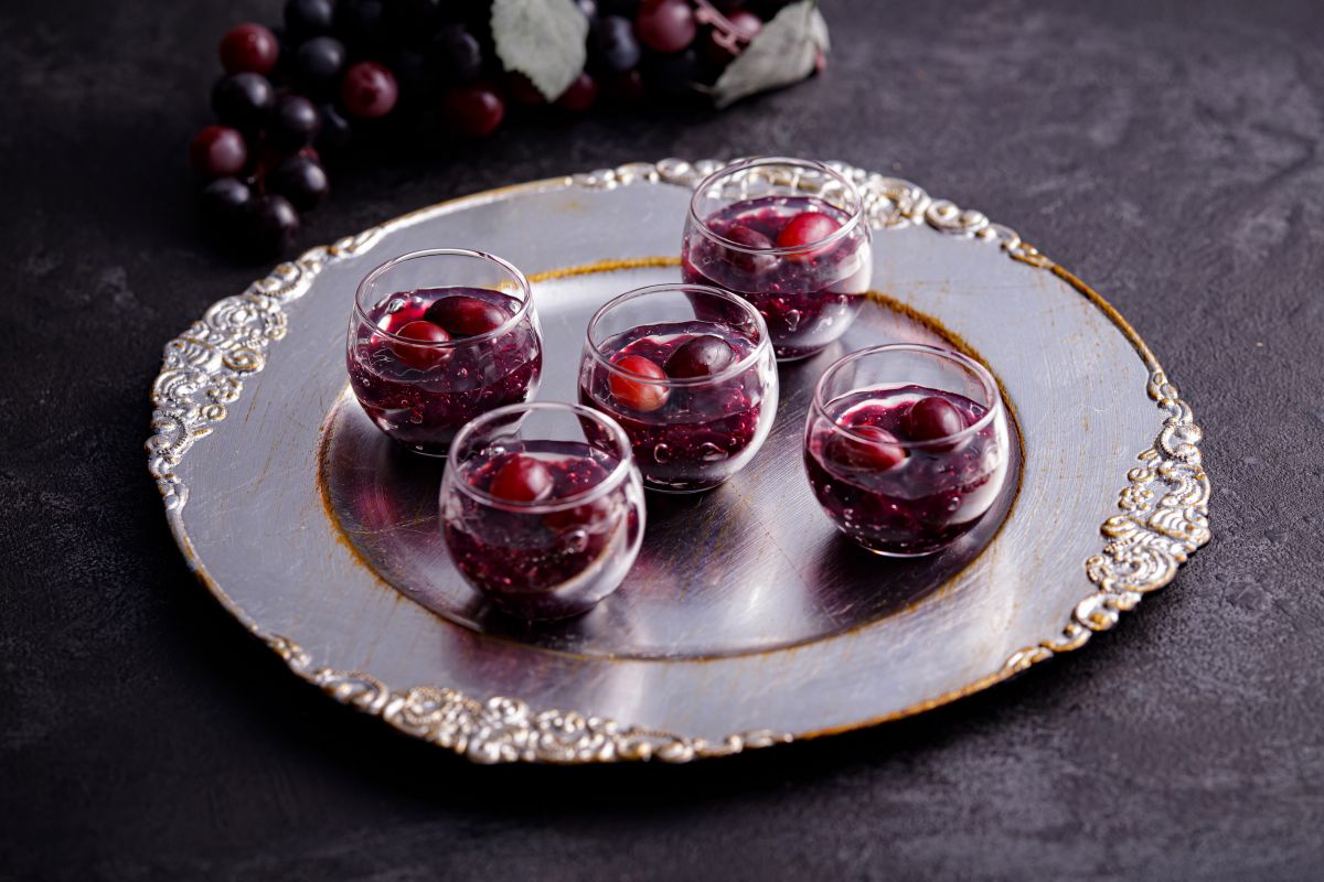 キラキラと紫色に輝く「ヨーグルトムースとぶどうのジュレ」は、写真映え間違いなし。サイズがミニマムなので、いろいろな種類を試せるのが嬉しいですね。