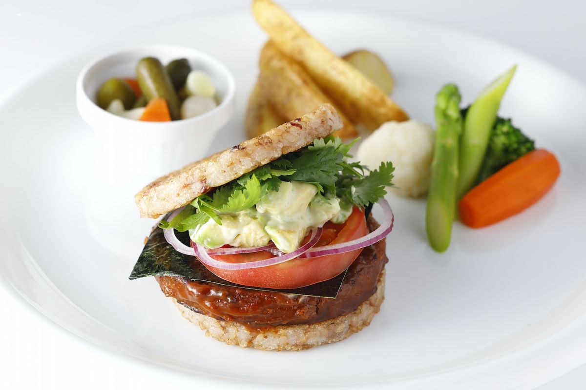さらに、ホテルニューオータニオリジナル国産八穀米「Jシリアル」のライスバンズに、大豆の成分から抽出した植物性たんぱく質を肉に見立てた大豆ミートパティと焼のりを挟んだ和風バーガー「新東京ライスバーガー」がビュッフェ初登場。満足感たっぷりのメニューでお腹いっぱいになること間違いなしです。