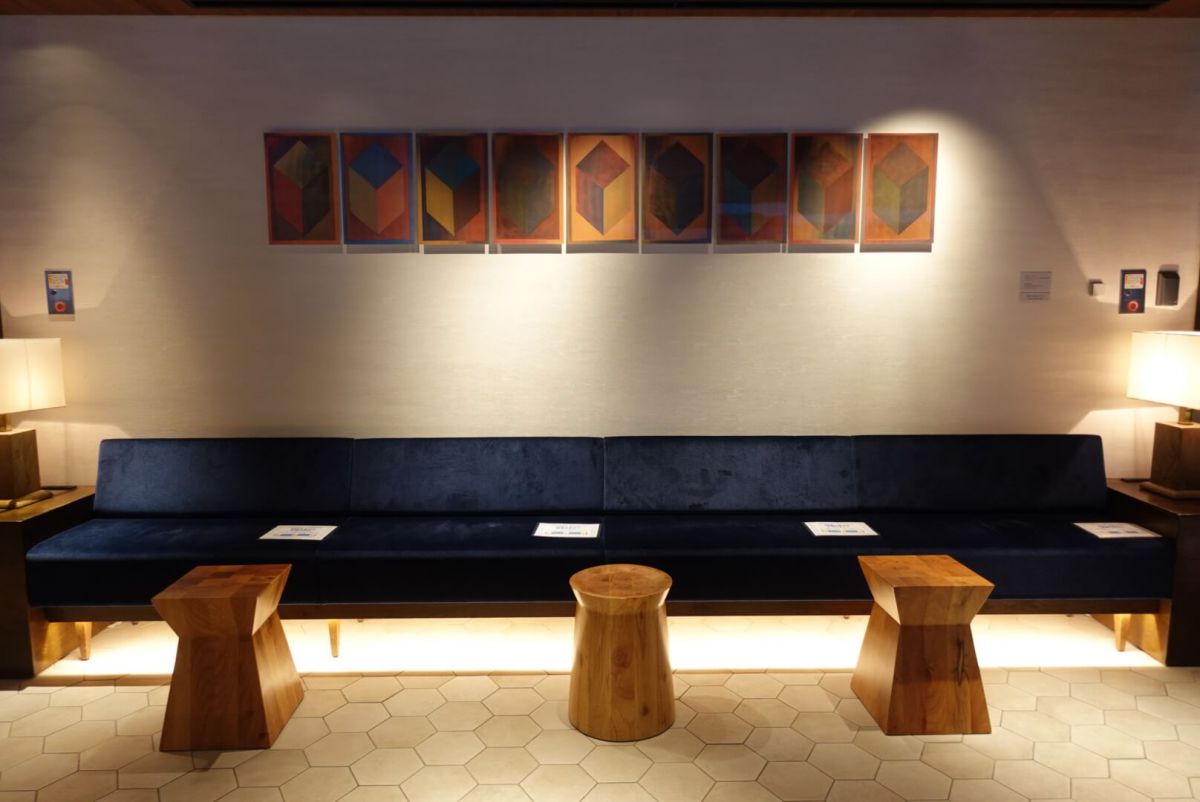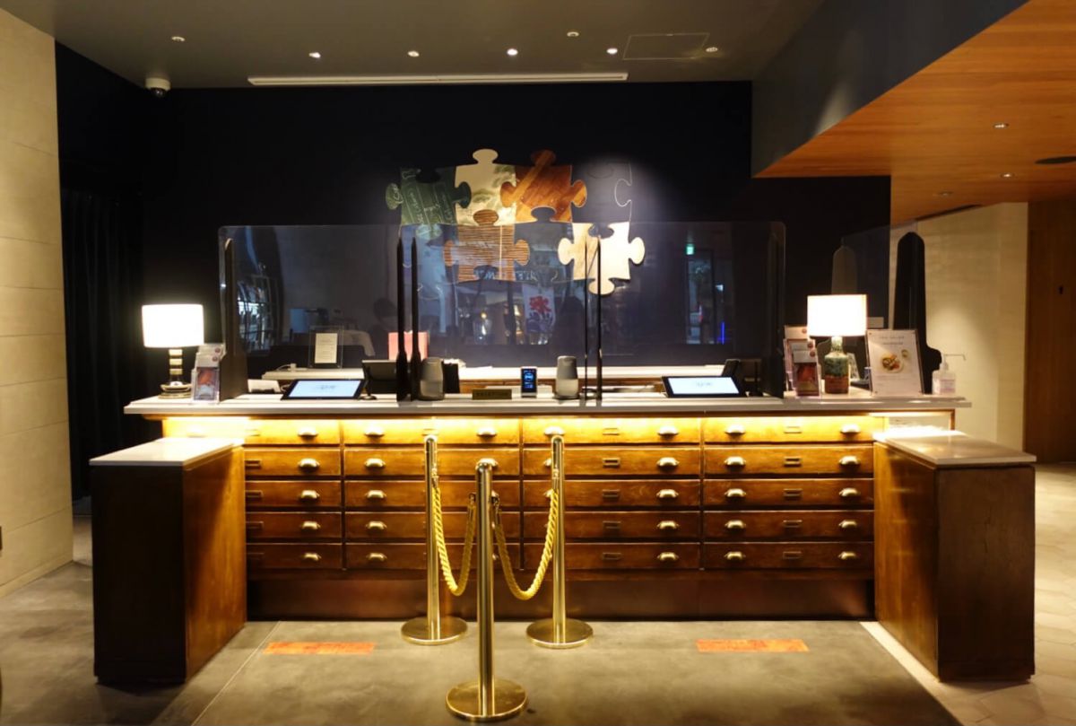 ロビーから、この通り。ヴィンテージ家具の棚と、壁のパズルアートが、色合いも風味も絶妙にマッチしていて、新旧の融合が体現された素敵なデザインとなっています。チェックイン時からいつもワクワクが止まりません…!