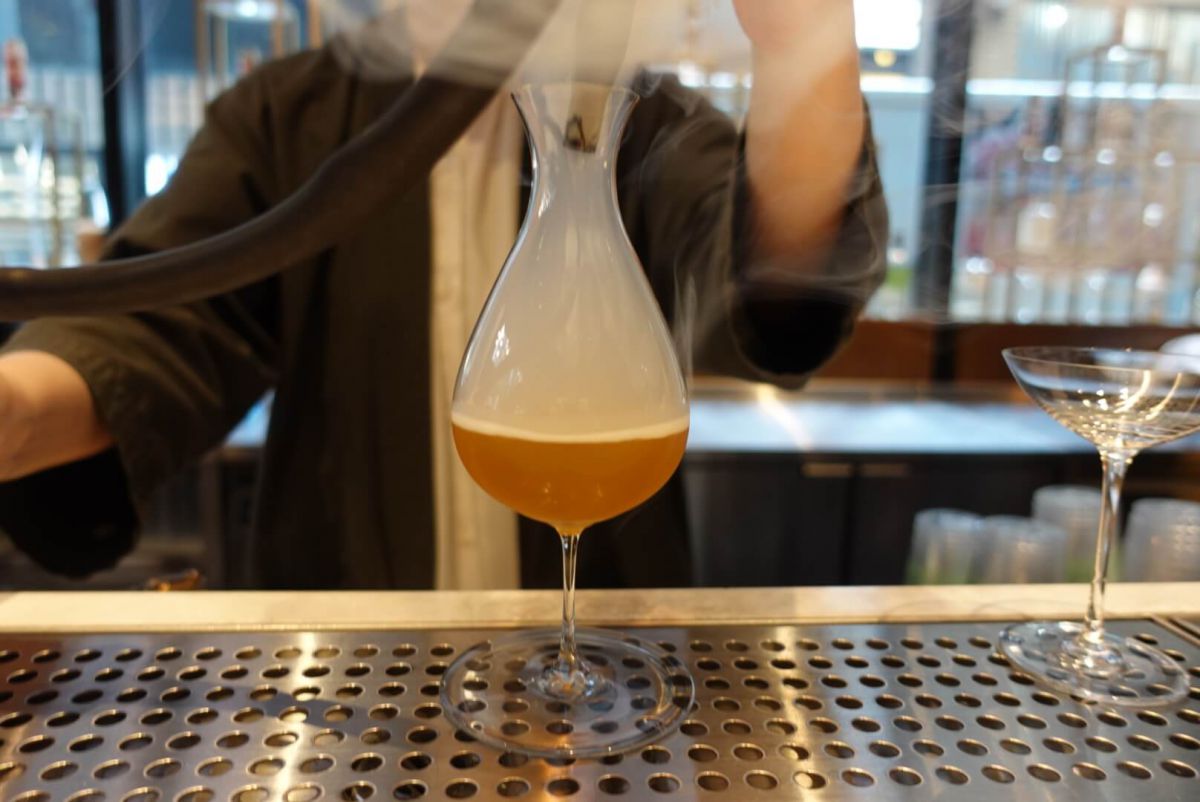 ほうじ茶やスパイス、はちみつなどを加えた特製のリンゴジュースを、アップルウッドのチップで、このように目の前で燻製してくれるのです!もくもくと広がる、この燻製の香りがたまらない~(燻製ラバーです(笑))。