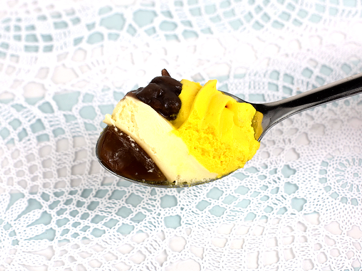 どこから食べ始めようか目移りしてしまいますが、まずは黄色い安納芋クリームからひと口。ねっとり濃厚な舌触りを堪能していると、上品な甘さが口いっぱいに広がります。安納芋はさつまいもの中でも深い甘みが特徴の品種。まさにスイーツ向きのさつまいもといえそうです。土台となる安納芋ムースはふわっと溶ける優しい口あたりで、ほっこり心が落ち着く味わいがたまりません。