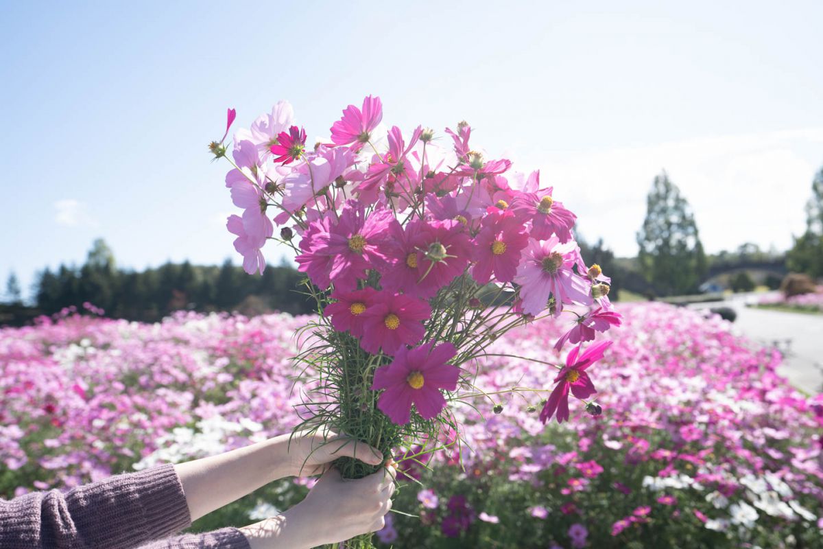毎年「備北コスモスピクニック」では、無料でコスモスの切り花体験をすることができます!2021年の開催日は10月16日(土)と10月17日(日)の2日間。各日先着200人限定の人気イベントです。切り花は1人10本までと制限がありますが、束ねると可愛らしい花束が完成します。事前に包装紙やリボンを用意して自分なりにアレンジするとより素敵になりますよ♡ぜひチャレンジしてみてくださいね。