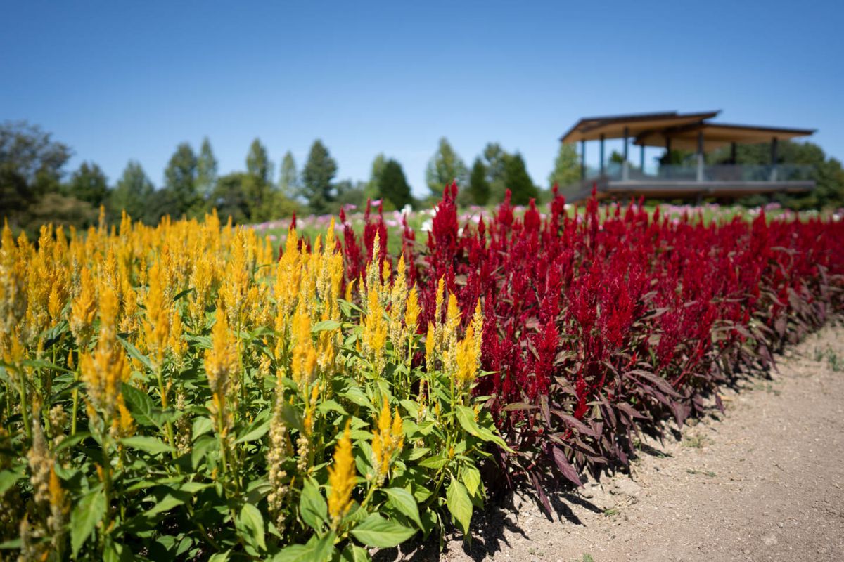 コスモス畑以外にも秋の花を観賞することができます。「備北コスモスピクニック」の開催中は、約52万本3品種のジニアと、約9万本1品種2色のケイトウが咲き誇ります。どちらも見頃は10月下旬頃まで。秋晴れの空の下ジニアとケイトウも一緒に楽しんでくださいね。