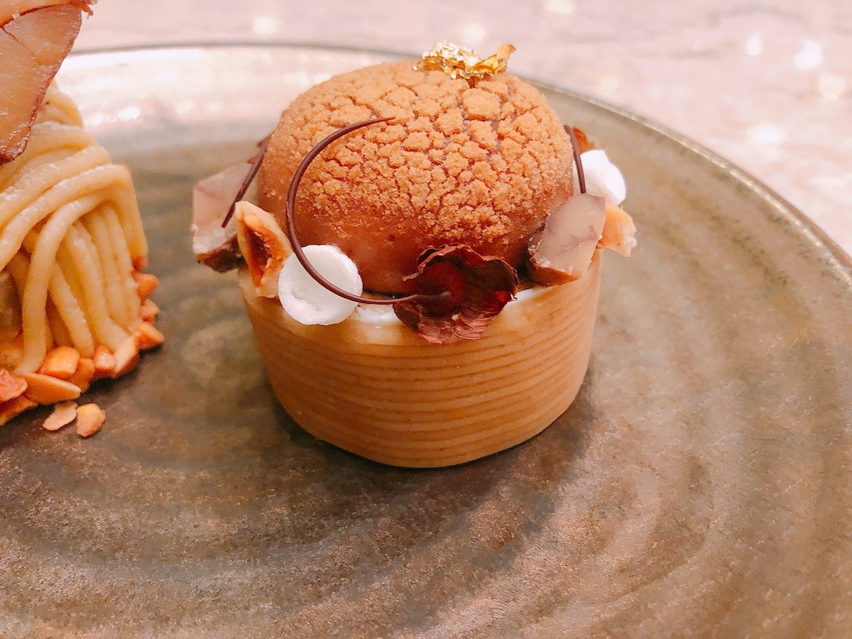 「新作モンブラン」は今回のプレートだけでいただける限定品。土台には栗と生クリームをベースにフランス産の栗のフォンダンソース、栗のペーストが使われており、栗の魅力を多彩に表現しています。その上には、栗のムースとカシスのムースをのせ、栗のパウダーをトッピング。