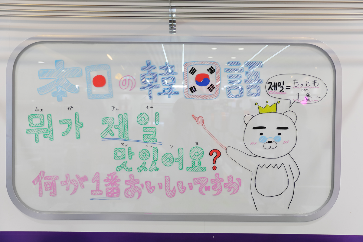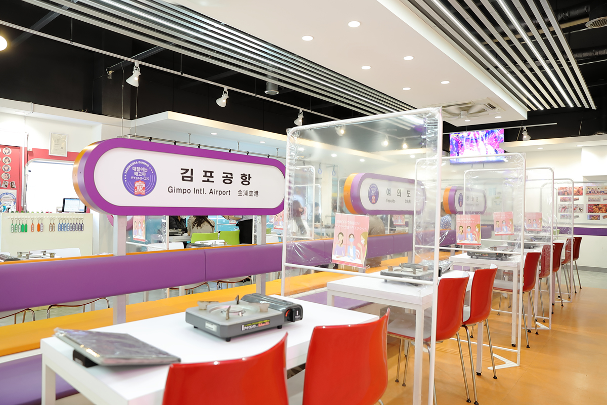 店内は韓国の地下鉄をベースにしていて、実際よりもさらにポップな色合いにしているのだそう。「金浦(キンポ)空港」や「明洞(ミョンドン)」、「梨泰院(イテウォン)」など、韓国旅行をしたことのある人ならピンとくる駅名が席名になっていて、旅気分がさらにアップします。