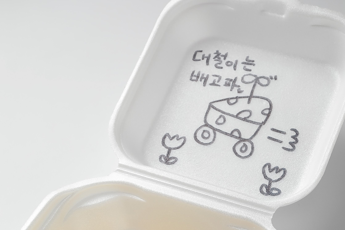 イートインとテイクアウト、両方で使われるケースにも注目を。一つずつ違う絵柄が手描きされ、その凝りように驚き!写真のハングル語は、店名「デチョルはペゴパ」と書かれているそう。