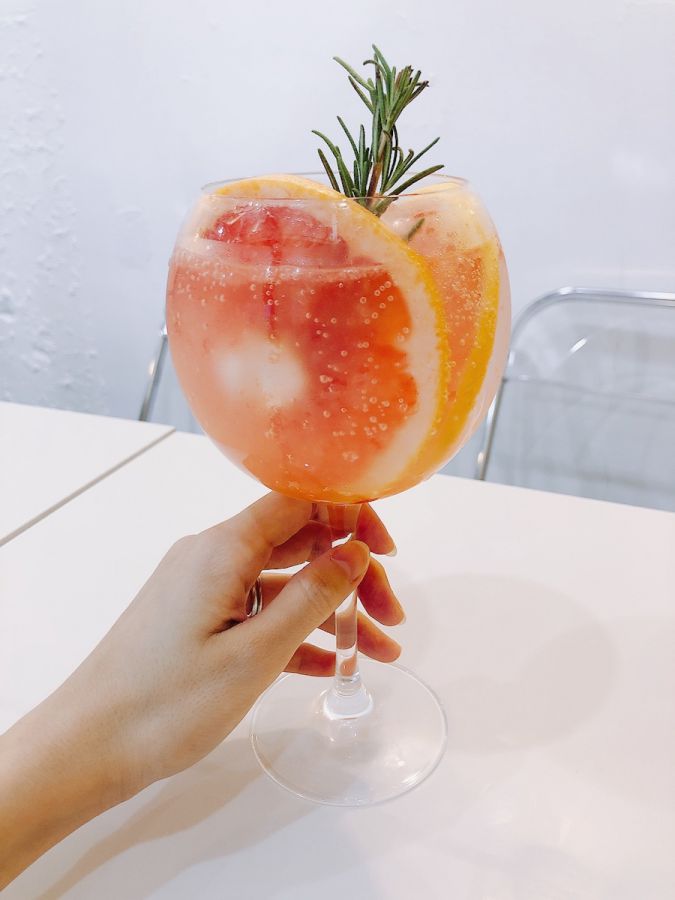 さらにドリンクも充実。韓国のカフェで代表的な砂糖漬けにしたフルーツを炭酸で割った「エイド」650円は、レモンとグレープフルーツの2種類から選べます。ワイングラスに大きなフルーツがたっぷりと入ったドリンクは味はもちろん写真映え必須です!ほかにも韓国風のいちごミルク「タルギウユ」650円など、韓国を感じられるメニューが揃えられており、カフェの利用だけでも歓迎とのこと。