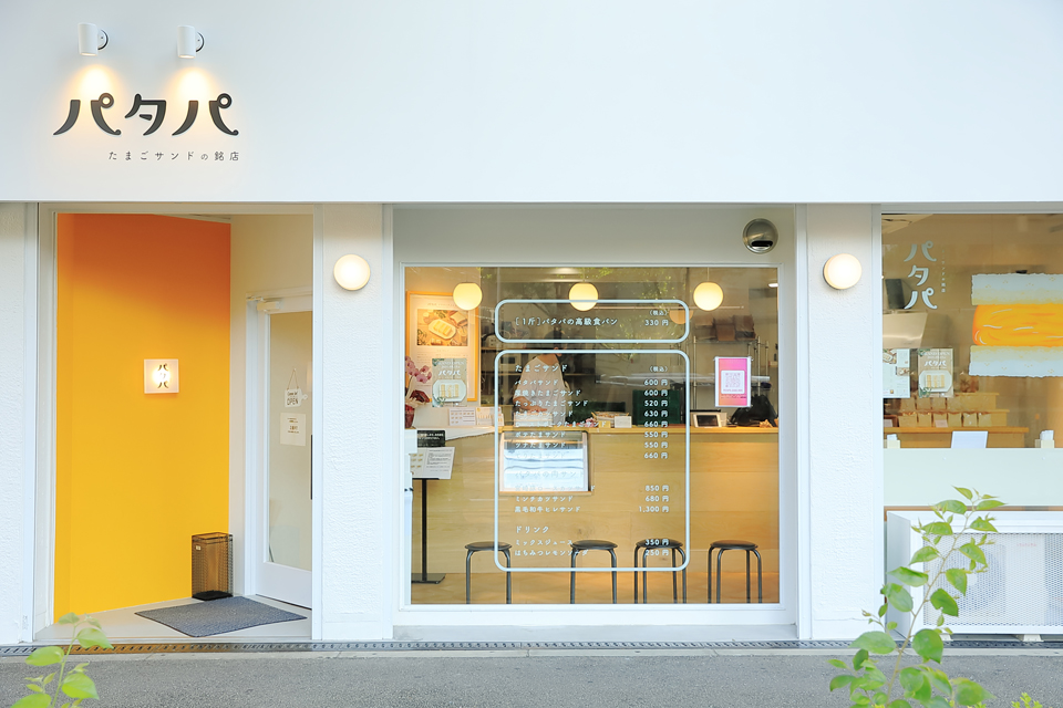 白と黄色を基調に「たまご」をイメージさせる、かわいいデザインのこちらが「たまごサンドの銘店 パタパ」。店名のパタパは、パン、たまご、パン、の頭文字でたまごサンドになっているんですね!謎解きが得意な人ならすぐにわかっちゃうのでしょうか!? 遊び心があって素敵です♪