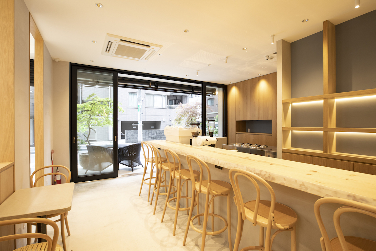 カウンター席とテーブル席のある店内は木を基調とした落ち着いた空間。目に鮮やかな植物の緑が迎えてくれる通りに面したテラス席もあるため、贅沢なスイーツをゆっくりと楽しむのにぴったりです。