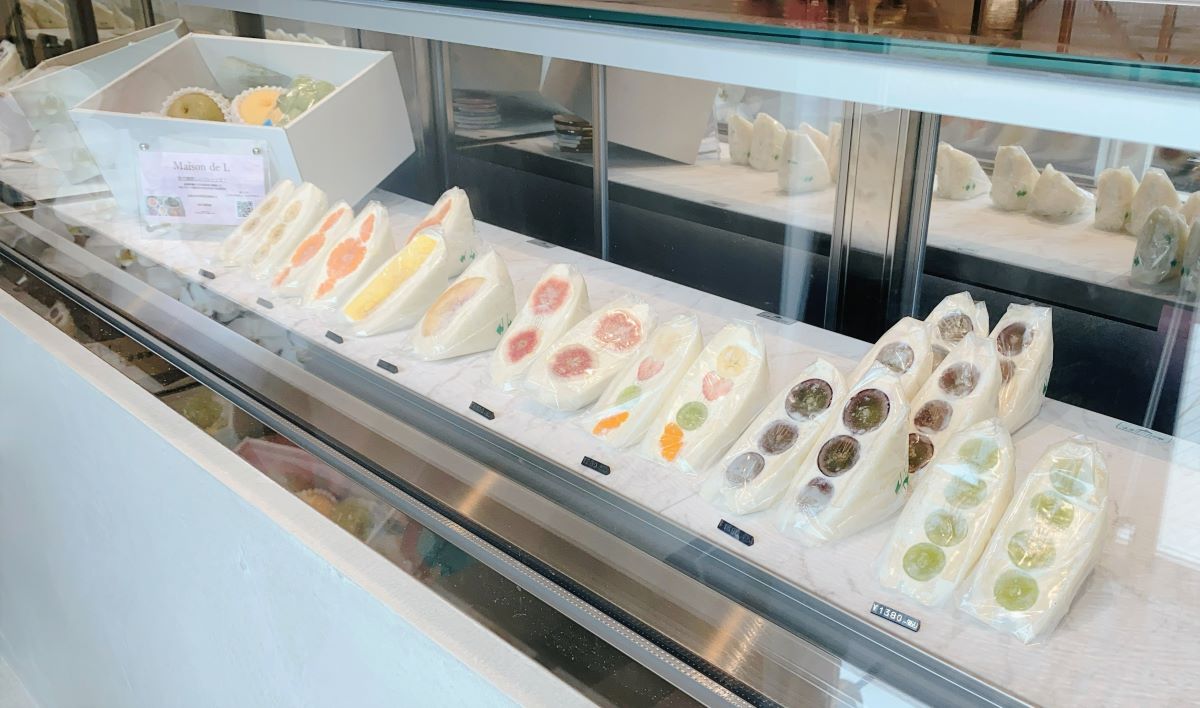 お店に一歩足を踏み入れれば、お出迎えしてくれるのはこのお店の看板メニューであるフルーツサンドたち。この日のラインナップは、シャインマスカット、ナガノパープル、ミックスフルーツ、いちじく、桃、みかん、バナナなどおよそ8種類。人気店のため早めに売り切れてしまうこともあるそうなので、どうしても食べたい方はインスタグラムのDMでお取り置き希望の連絡を!