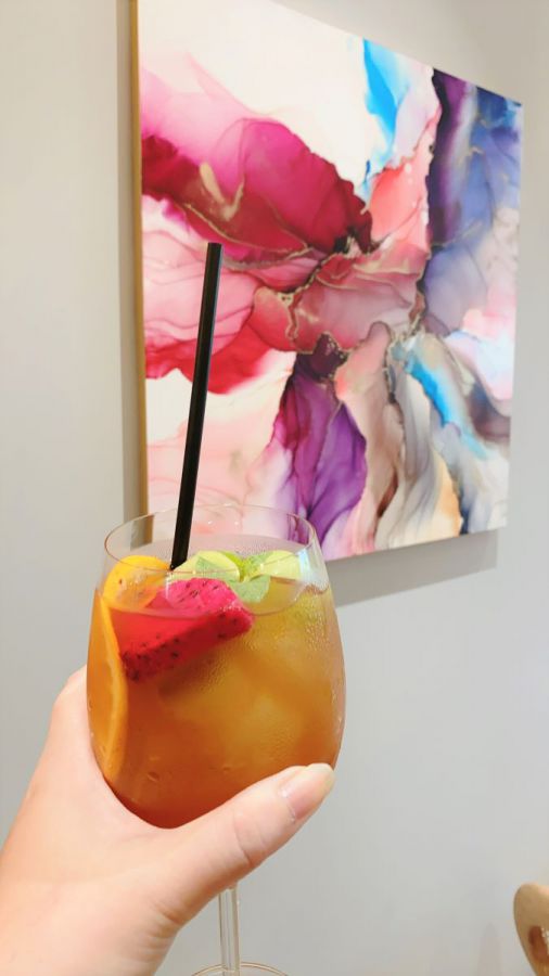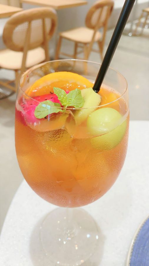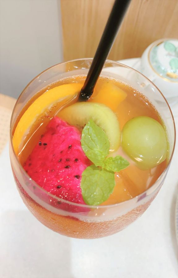まず注文したのは、目にも鮮やかな「大人の贅沢ゴロゴロフルーツティー」1500円。ドラゴンフルーツ、シャインマスカット、キウイ、レモンなど旬の食べごろフルーツが、その名の通りゴロゴロと入ったフルーツティー!