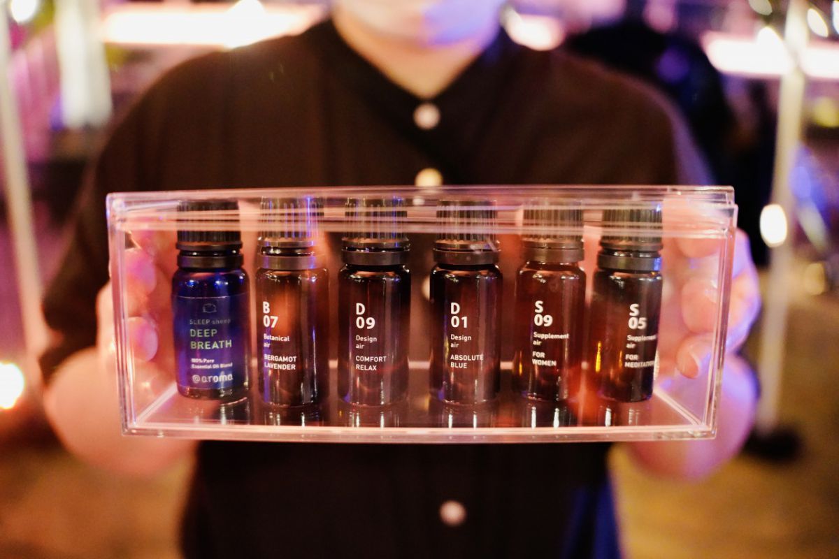 受付では、サウナテントのなかで香らせるロウリュウアロマを1種類選びます。自身と向き合いたい時にぴったりの「メディテーション」、非現実感に包まれる「アブソリュートブルー」など全6種類から体調や気分に合わせてチョイスしてみて。