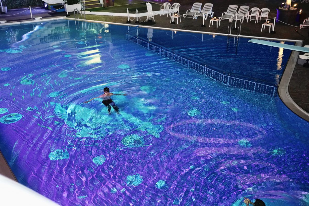 アウトドアサウナで身体の芯から温まったらシャワーで汗を流し、水風呂代わりにホテル自慢のナイトプールへGO!