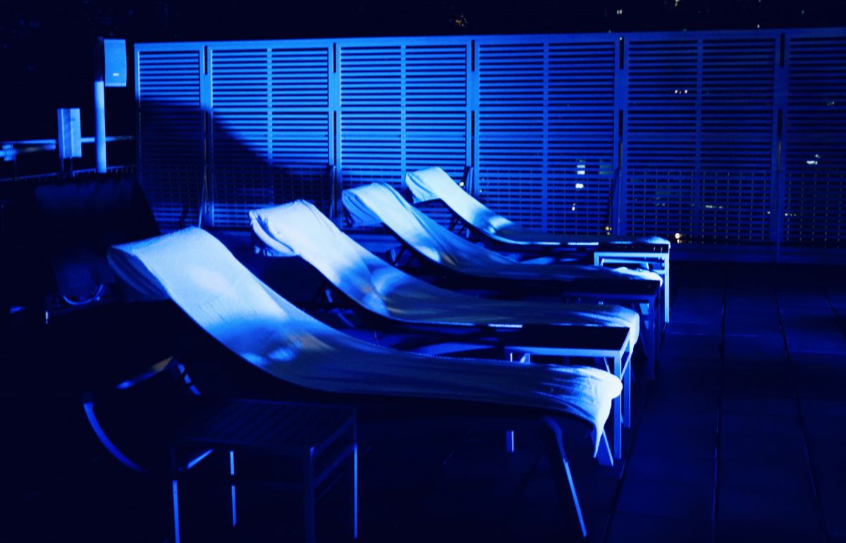 シートに寝そべると、心拍数を図るバイタルセンサーが作動して休憩中の人物の心拍数をセンサーで測定。なんと、その場にいる人たちの平均心拍数が鼓動のリズムとなり、BGMとシンクロして鳴り響く、音と光のメディテーション外気浴なのです!