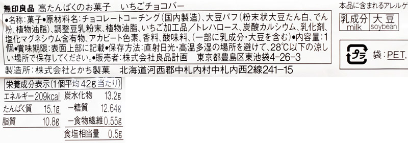 まずご紹介するのは、大豆パフとドライイチゴをチョコレートに混ぜ込んだ「いちごチョコバー」150円。チョコレートなのに、1本(42g)あたりの糖質が12.64g、エネルギーが209Kcalに抑えられているうえ、たんぱく質もしっかり15.1g補給できるプロテインバーです。