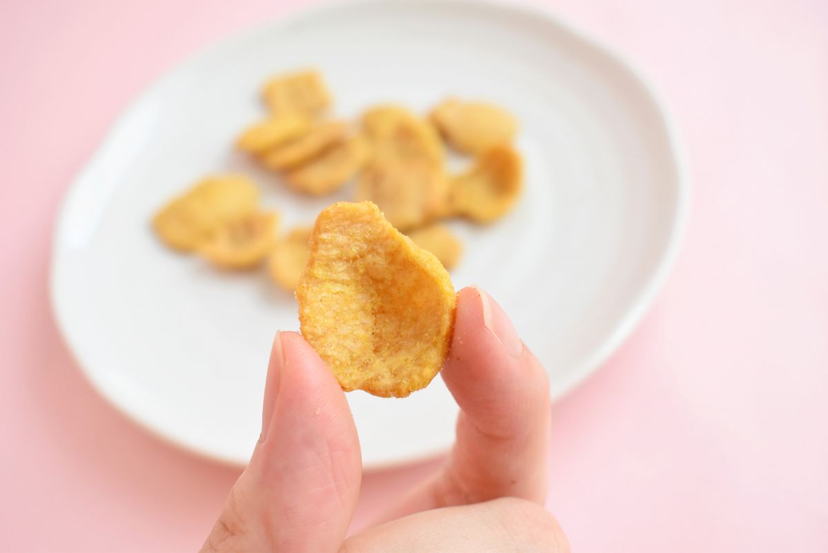 親指の爪大ほどの一粒を、さっそく食べてみると、ガリッとしたかための食感で歯ごたえがあるので、少し食べただけでも満腹感が得られそう。ポテトチップスやコーンスナックなどのサクッとした食感とは違っていて、かためのお煎餅のような感じです。