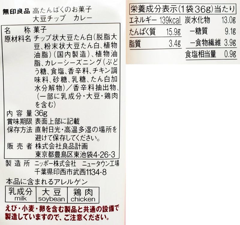 お次は、大豆を使ったカレー風味のスナック菓子「大豆チップ カレー」150円。1袋(36g)あたりの糖質は9.1gと低く、たんぱく質は15.9g摂取できます。