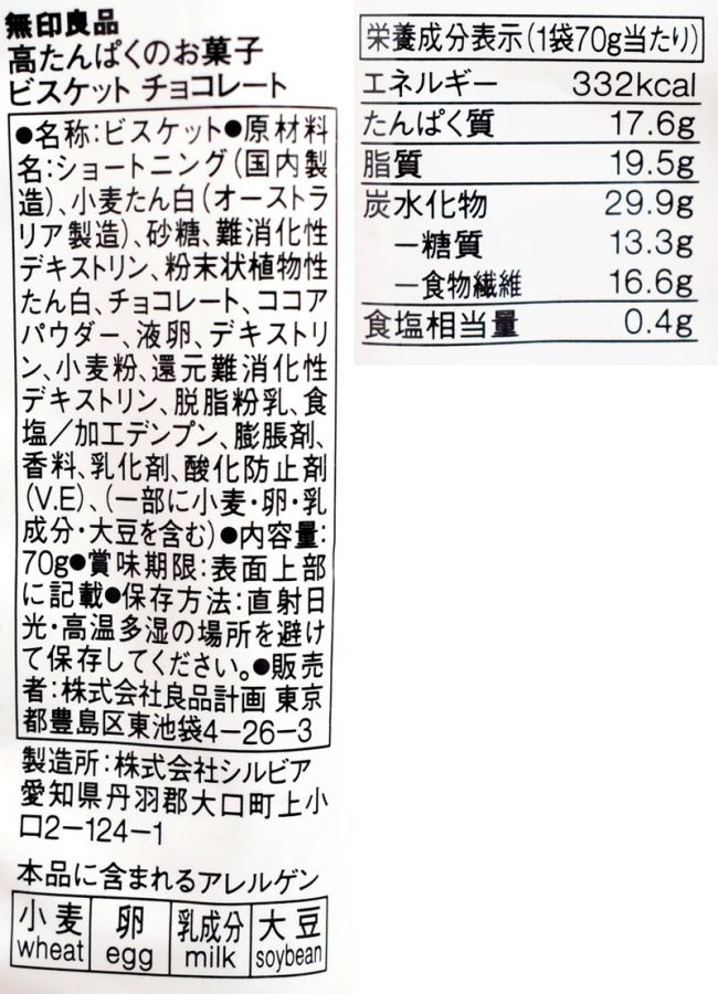 最後は、小麦たんぱくなどを使って糖質を抑えた「ビスケット チョコレート」250円。1袋(70g)あたりの糖質は13.3gと控えめで、たんぱく質はしっかり17.6g含まれているのがうれしいですね。