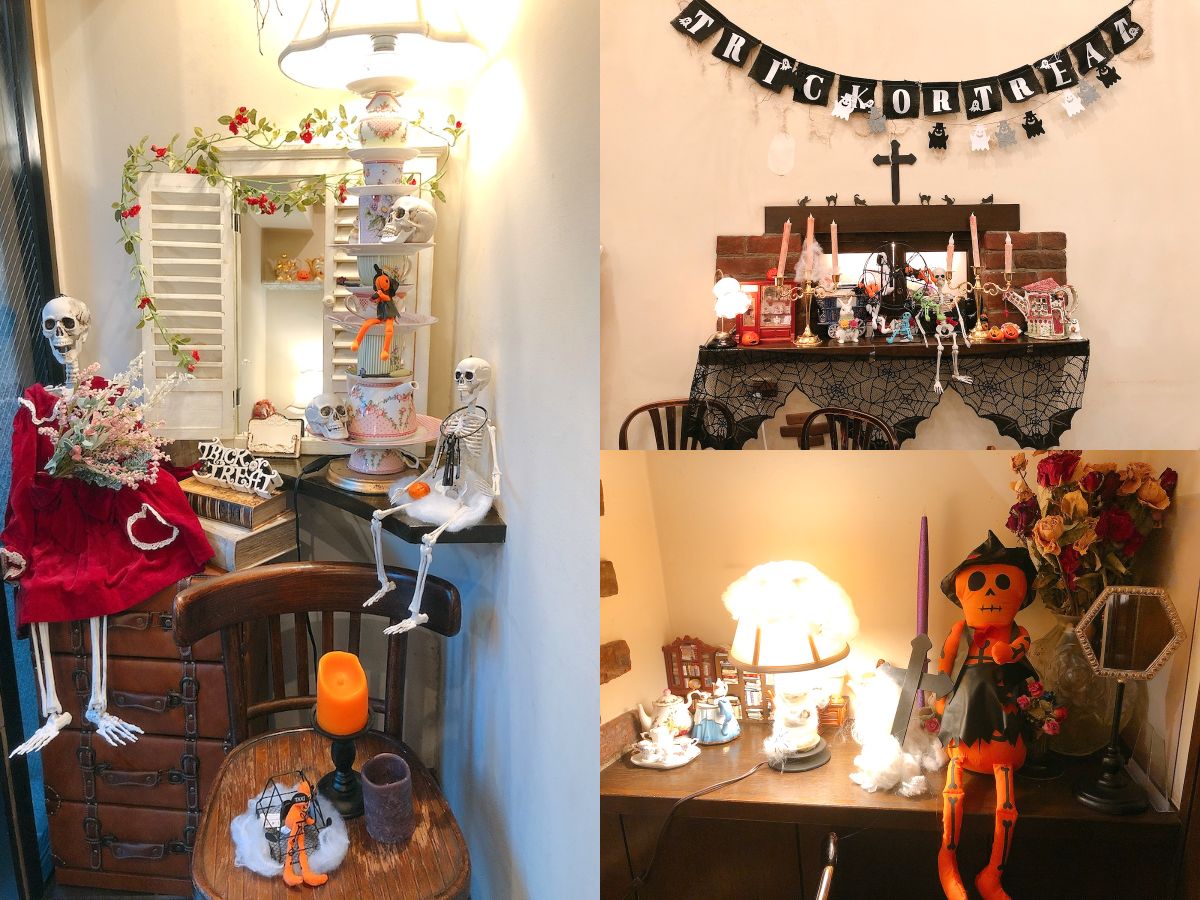 そんな「アコリット」は季節やイベントごとに気合いの入った装飾や自慢のアフタヌーンティーが楽しめることでも有名です。今回のテーマはもちろんハロウィン!入口からガイコツたちが出迎えてくれて、店内のいたるところにハロウィンならではの飾りがほどこされています。オーダー前からテンションが上がりそう!