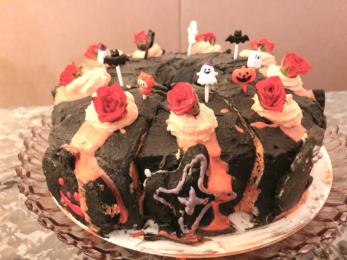 自慢のシフォンケーキは日替わりで並ぶ4〜6種類ほどのなかから選ぶことができます。ハロウィンのおすすめは真っ黒なシフォンケーキ。食用の安全な竹炭と、オーナーが農家まで行って厳選したというこだわりの卵を使っているため、おどろおどろしい見た目とは裏腹にやさしい味わいとふんわりとした食感が魅力です。ハロウィンバージョン以外にもモンブランや生クリームのケーキも選択できますよ。