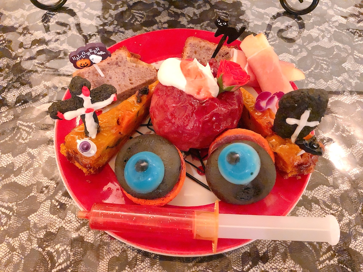 中段はゼリーで作った目玉がのったマカロンが印象的。中央にはバターと赤ワインで味付けして、オーブンで焼いた小ぶりのりんごを丸ごと1つのせています。紫いものフィナンシェやかぼちゃのタルトなど秋の味覚も満載。ハロウィン気分を高める注射器には甘いシロップがたっぷり入っているので、りんごやシフォンケーキのトッピングとして使ってくださいね。