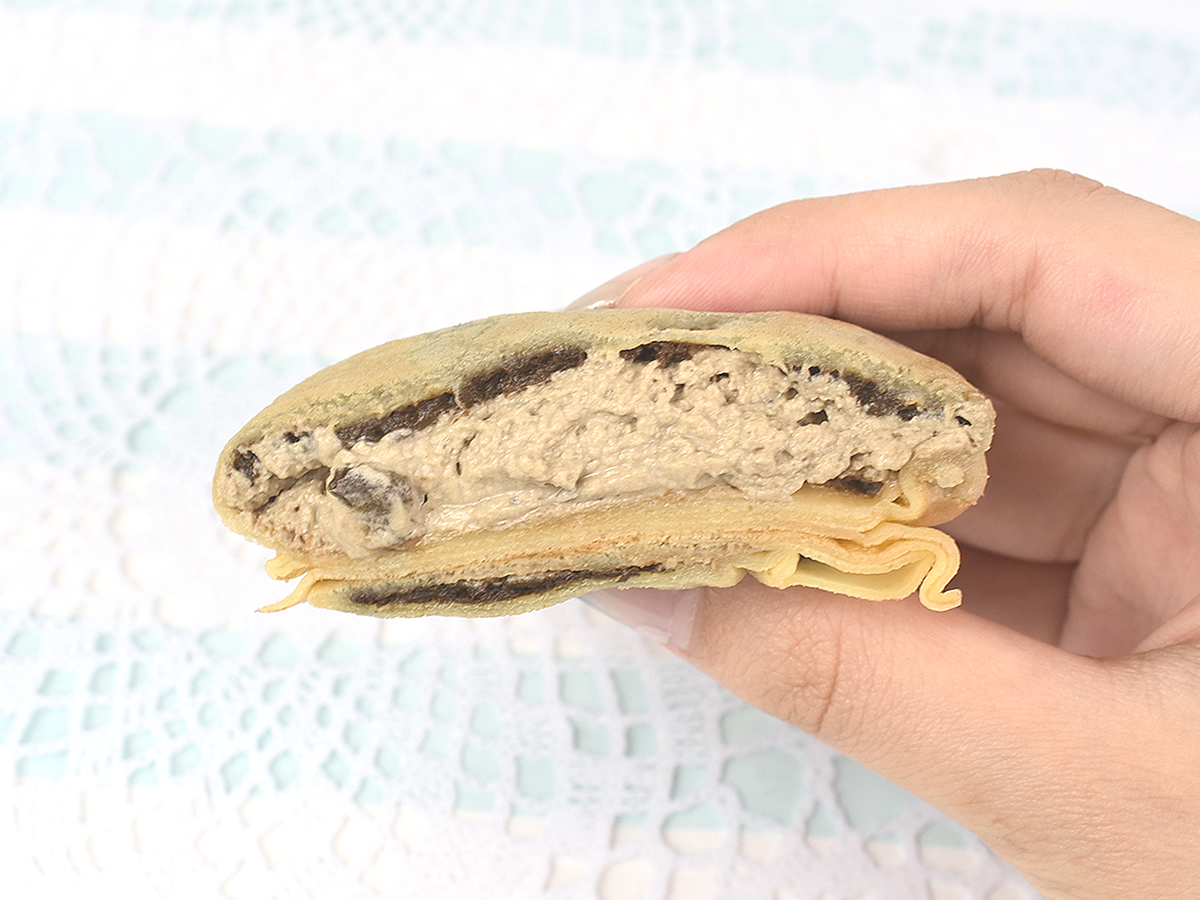淡い茶色の「ほうじ茶ホイップクリーム」も絶品。なめらかな口溶けと上品な甘さを堪能できました。コク深い味わいの秘密はミルクチョコレート。軽い口当たりながら、強い風味を味わえます。2つのクリームの異なる風味が調和し、クレープを食べているのにほうじ茶を飲んでいるかのような錯覚が起きてしまうかも…。