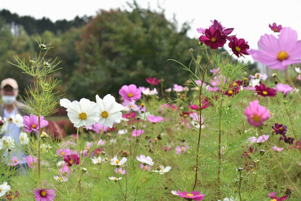 広々とした園内は、手入れが行き届いた英国風ガーデンと自然のままの木々との調和が見事。コスモスは主になだらかな斜面合計約1000平方メートルに11品種20万本が植えられ、上や下、真横と、さまざまな角度から花の表情を眺められるのが魅力です。