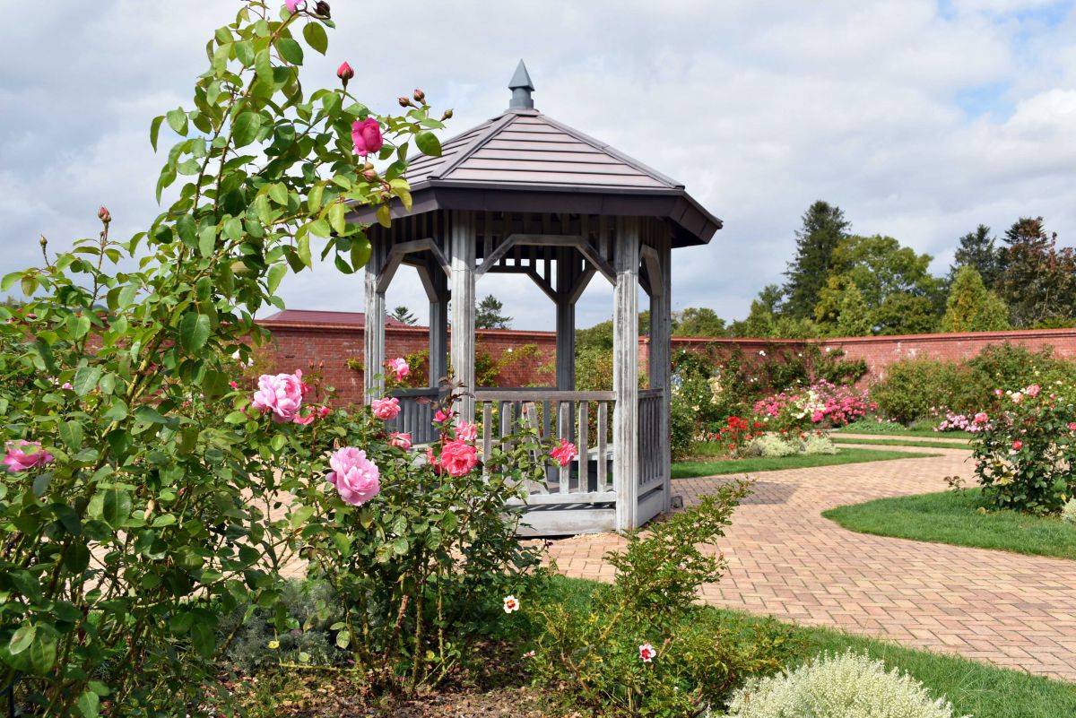 それぞれに個性豊かな表情を見せてくれますが、なかでもぜひ訪ねてほしいのがローズガーデン。なかに入るとふわりとしたバラの香りが出迎えてくれ、幸せいっぱいの気分に包まれます。東屋の椅子でほっと一息つくのもいいですね。