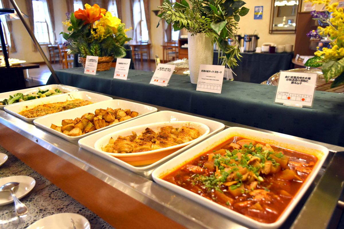 ゆにガーデンは、お料理のおいしさにも定評があります。レストラン「チャイブ」のバイキングは、地元産の新鮮野菜がたっぷり。ヘルシーで体にやさしい料理を思いっきり楽しめます。