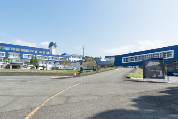 施設を利用する際は、まずホテル棟へ。富士山を彷彿とさせる外観のブルーは、施設のイメージカラー。青い空によく映えます。