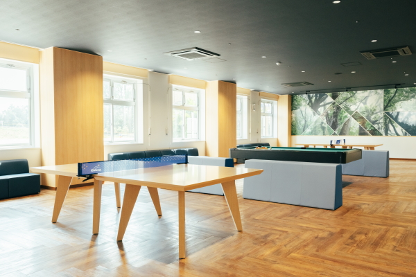 卓球場と同じ建物には、卓球台やビリヤード台が置かれたフリースペースが。ラフな雰囲気で卓球やビリヤードをしたり、白熱しすぎたゲームの休憩をしたりと、過ごし方はいろいろ。