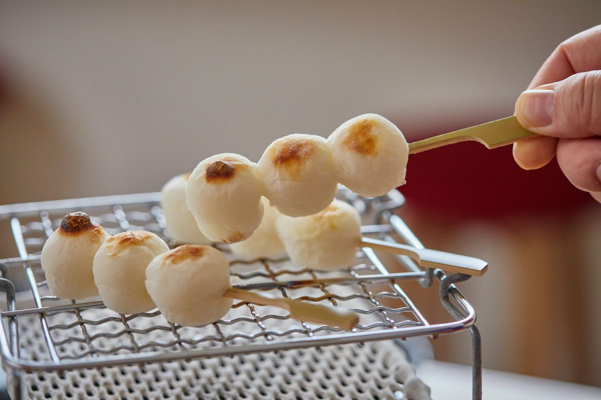 店名の「十五番」は、オハコ(十八番)を三歩後ろから追いかけるという意味と十五夜にだんごを食べることをかけあわせて付けられたそう。それだけにだんごに対しての思いは強く、炙るだんご、炙らないだんご、タレをかけるだんご、きな粉をかけるだんご、それぞれに国産うるち米100%を使っていて、こねるときの水分量などを変えているそう。