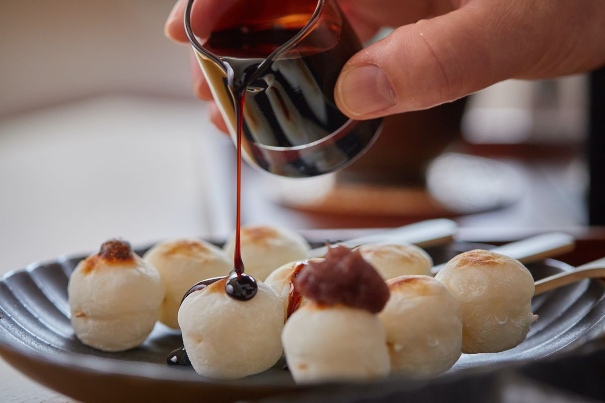薬味皿には、きな粉、みたらしのタレ、つぶあん。別添えで黒蜜が用意されていて、取り皿の上で好きな味をトッピング。