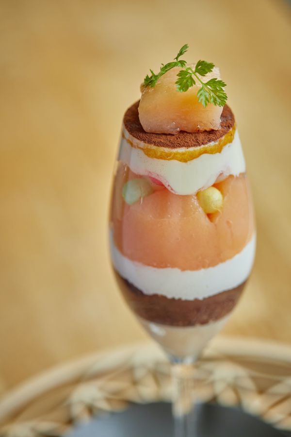 個人的にすごく好みだったのが、「桃のティラミス」。下から自家製桃のムース、十勝産小豆の粒あん、生クリーム、桃のコンポート、おいり、マスカルポーネのティラミス、パウンドケーキの自家製シロップ漬け、上にも桃のコンポート。