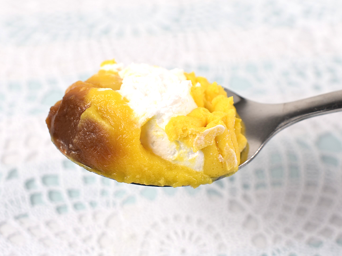 まずはたっぷりと絞られたパンプキンクリームを味わってみることに。一口食べると、かぼちゃの濃厚な風味がフワッと口いっぱいに広がりました。深みのあるこっくり甘い味わいがたまらない…! ホクホクと仕上げたかぼちゃの煮物ような、素材本来の味を感じられます。