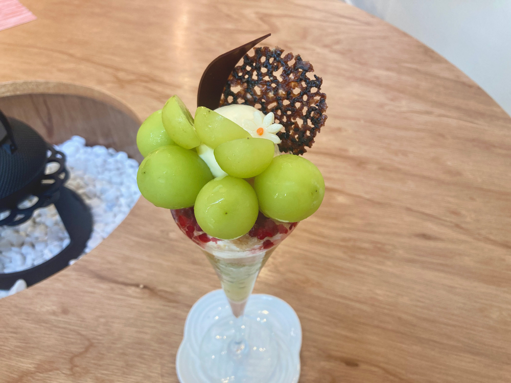 パフェはシャインマスカットがふんだんに使用されていて、とっても贅沢。チョコレートとともにゴマのチュイール(クッキー)もトッピングされており、和の味覚との組合わせも堪能できます♪