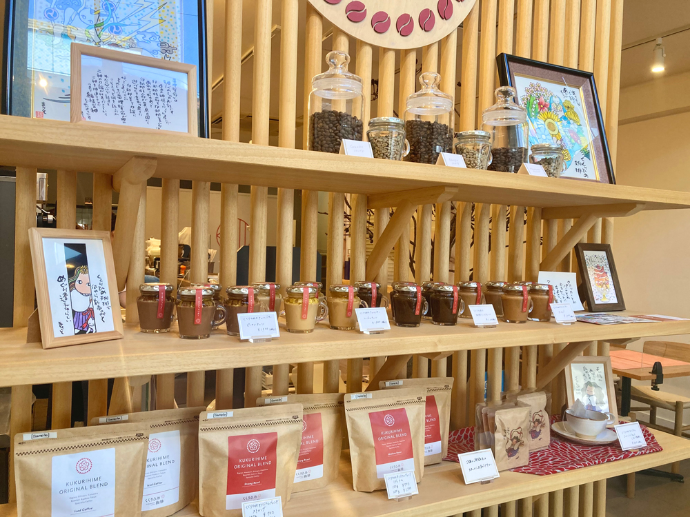 「くくりひめ珈琲」のコーヒーは、お店にて自家焙煎しています。雑味の出てしまう豆を手作業で取り除き、クリアな口当たりにこだわっているそう。コーヒーを使用したカフェドリンクも、和スイーツと合うさわやかな甘みと華やかに広がる香りが特徴です。