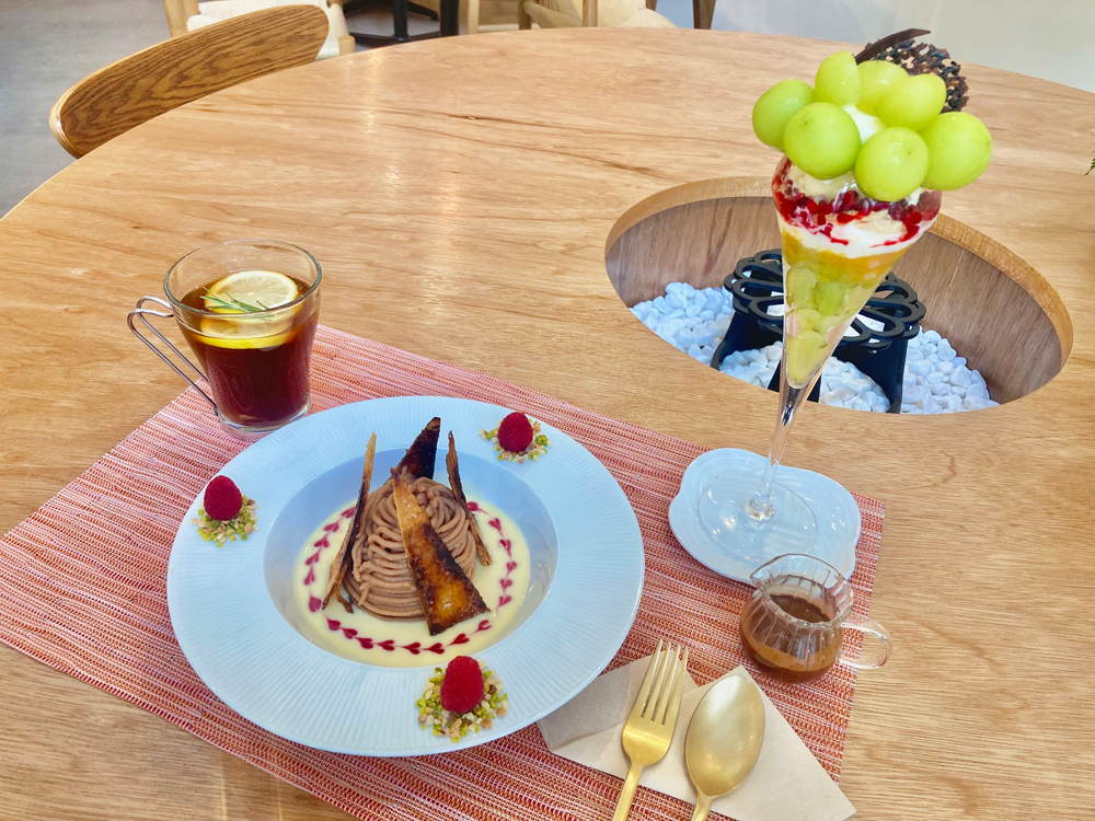 「くくりひめ珈琲」には、季節のフルーツを使用したスイーツが並びます。特に人気でSNSでも注目されているのが、「くくりひめの嫁入り」というパフェ♪季節のフルーツをふんだんに使用し、秋はシャインマスカットのパフェがいただけます。