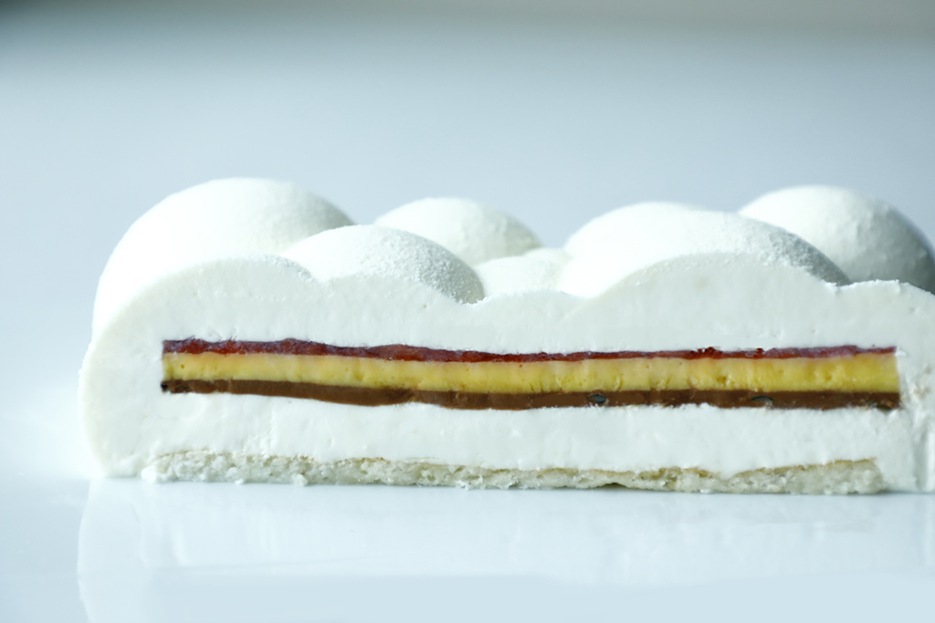 2種類のケーキは、見た目はもちろん味にもこだわっています。ホワイトチョコレートのムースの中にはチョコレートとパッションフルーツのクリーム、苺のジュレが3層になっていて、甘いクリームとフルーツのほどよい酸味が絶妙!