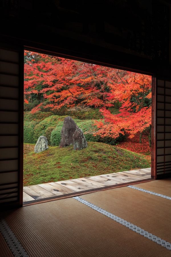 本堂の縁側や鴨居を額縁に見立てれば、波心庭を絵画のように愛でることができます。まるで時間が止まったような静かなひとときを過ごすことができますよ。室内からだと、紅葉がより鮮やかさを増して見えますよね!