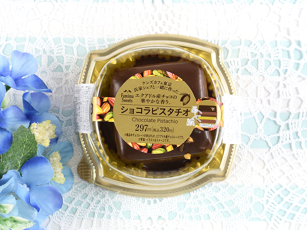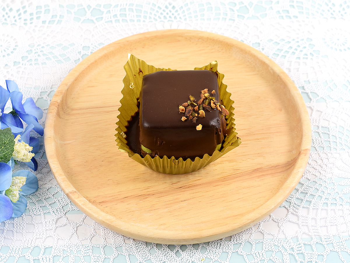 チョコレートでコーティングされたキューブ型のデザインはシンプルかつ上品! 洋菓子店のショーケースに並んでいても違和感がないほど高級感に溢れています。ちなみに「ショコラピスタチオ」に使われているのは、ガトーショコラ専門店「ケンズカフェ東京」の氏家健治シェフが監修したファミリーマートオリジナルチョコレート。カカオの名産地・エクアドル産のカカオ豆を用いているため、本格的な風味にも期待できそうです。