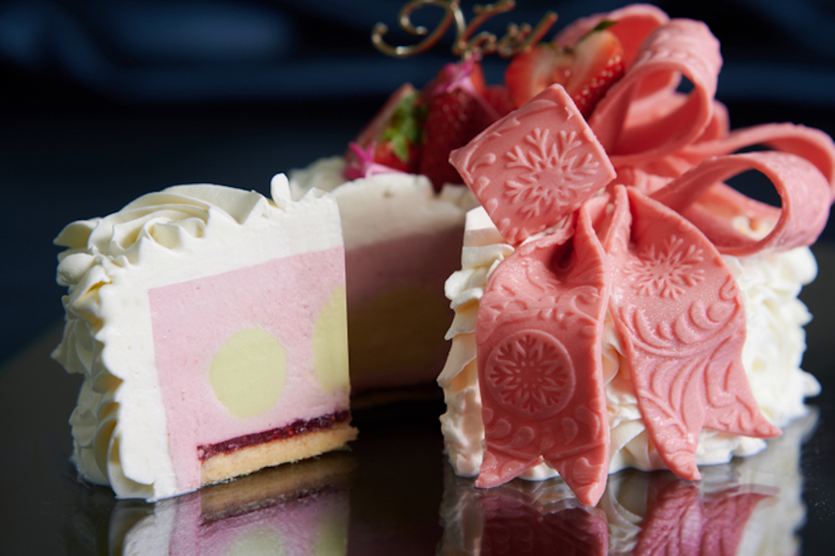 甘酸っぱいいちごとフランボワーズのムースに、濃厚なピスタチオクリームを合わせた「ビジューリボンムースケーキ」5400円は、アクセントにフランボワーズの種入りコンフィチュールがサンドされています。バラのように絞りを入れたクリームと大きなリボンがアクセントのムースケーキです。