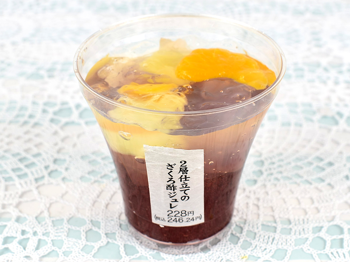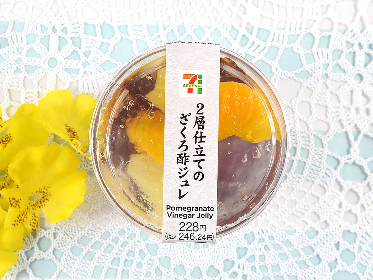 あま~いコンビニスイーツに目がない私ですが、時には「甘さ控えめでさっぱりしたデザートが食べたいな…」と思うことも。そこで今回はセブン-イレブンで発見した「2層仕立てのざくろ酢ジュレ」(246円)をピックアップしました。ざくろ酢とフルーツを使い、スイーツとはいえ、ヘルシーなゼリーを味わってみましょう。