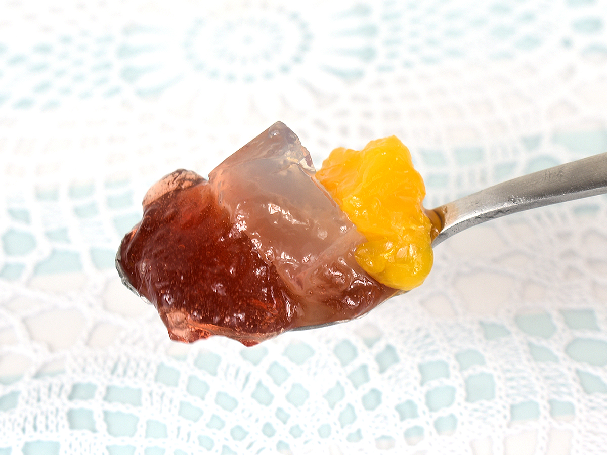 さらにソーダ風ゼリーとざくろ酢ゼリーを一緒に食べれば、酸味がやわらいで口当たりがマイルドになります。あくまで“ソーダ風”の味なので、炭酸飲料が飲めない人もご安心を。またみかんとパインのジューシーな果肉と、コリコリした寒天も食感に変化を与えてくれました。