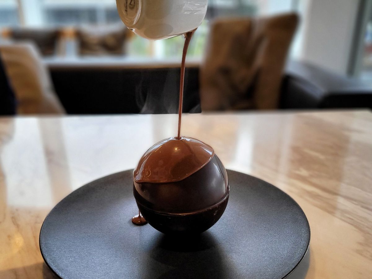 お店の1番人気のメニュー。球体型のチョコレートにデザートが包まれているという一品です。